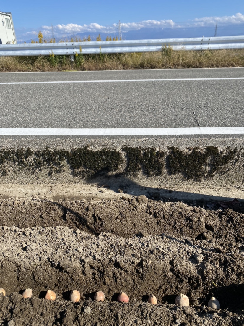 2021.11.06 お知らせ フラワーロード冬支度 秋晴れのもと、来春に向けての冬支度です。 会社前の道路を花できれいにしようと、 町内会長さんを中心に取り組んでいます。 立山連峰をバックに並べた球根。 春にはたくさんのチューリップが咲き誇りますように・・。